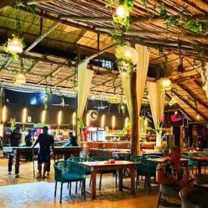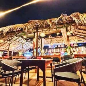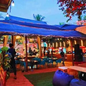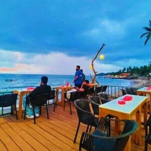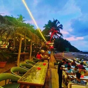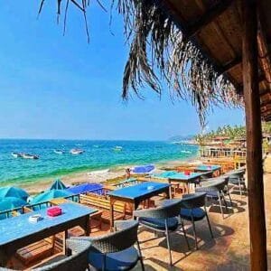 The laid-back vibe, loungers, and trance music create a typical “Goa shack” ambiance.