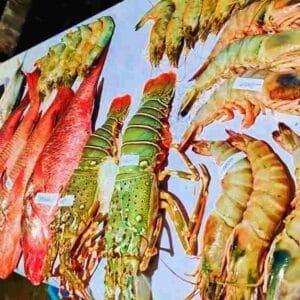 Seafood specialties like butter garlic crab, calamari, and prawn curry