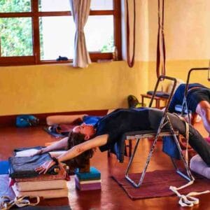 Heavy use of yoga props (blocks, belts, chairs) to support proper form and alignment