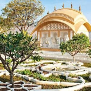 - The garden is designed in the Mughal charbagh style, with symmetrical layouts and lush greenery.