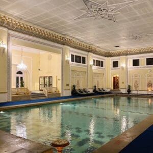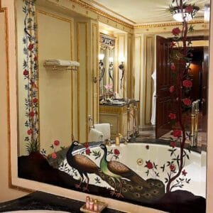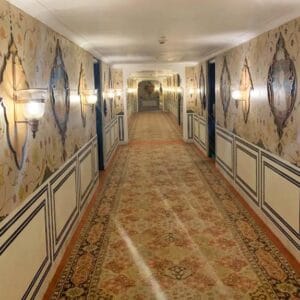 • The interiors are adorned with hand-painted frescoescrystal chandeliers, and antique furniture.